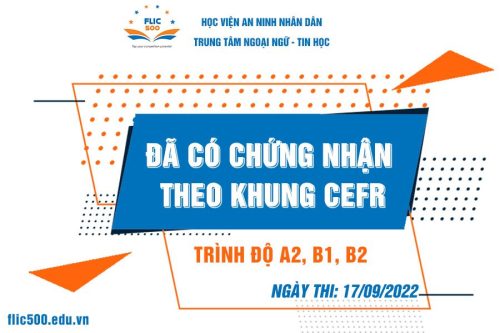 Trung tâm Ngoại ngữ – Tin học thuộc Học viện An ninh nhân dân (FLIC500) thông báo đã có chứng nhận Kỳ thi đánh giá năng lực tiếng Anh theo Khung tham chiếu chung Châu Âu (CEFR) dành cho các thí sinh tham dự kỳ thi ngày 17/09/2022 các trình độ A2, B1, B2. Các thí......