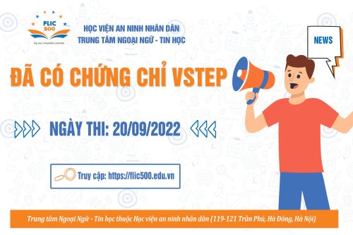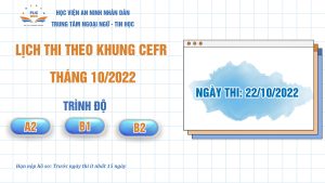 Trung tâm Ngoại ngữ – Tin học Học viện An ninh nhân dân (FLIC500) thông báo lịch bồi dưỡng, thi cấp chứng nhận đánh giá năng lực tiếng Anh trình độ A1, A2, B1, B2 theo Khung tham chiếu chung Châu Âu (CEFR) tháng 10/2022 như sau: 1. Lịch thi dự kiến: ngày 22/10/2022 2.......