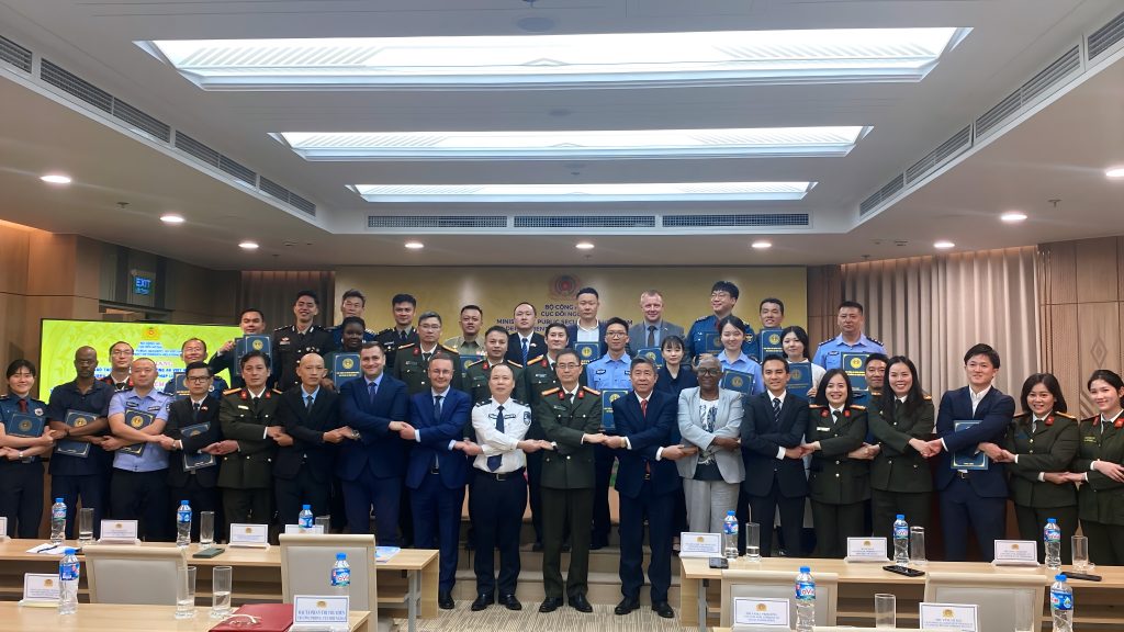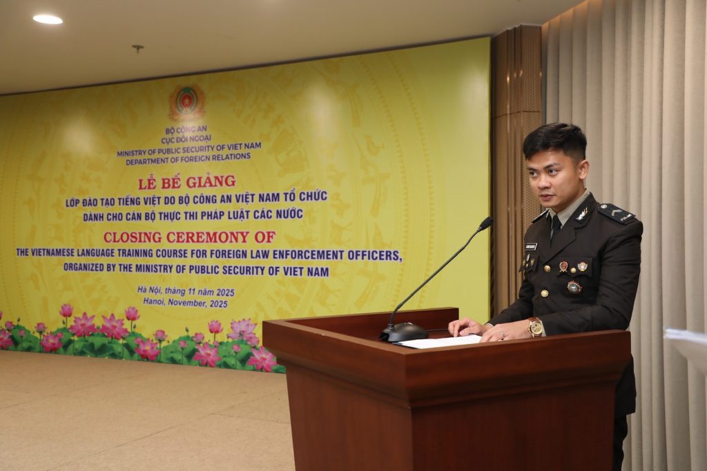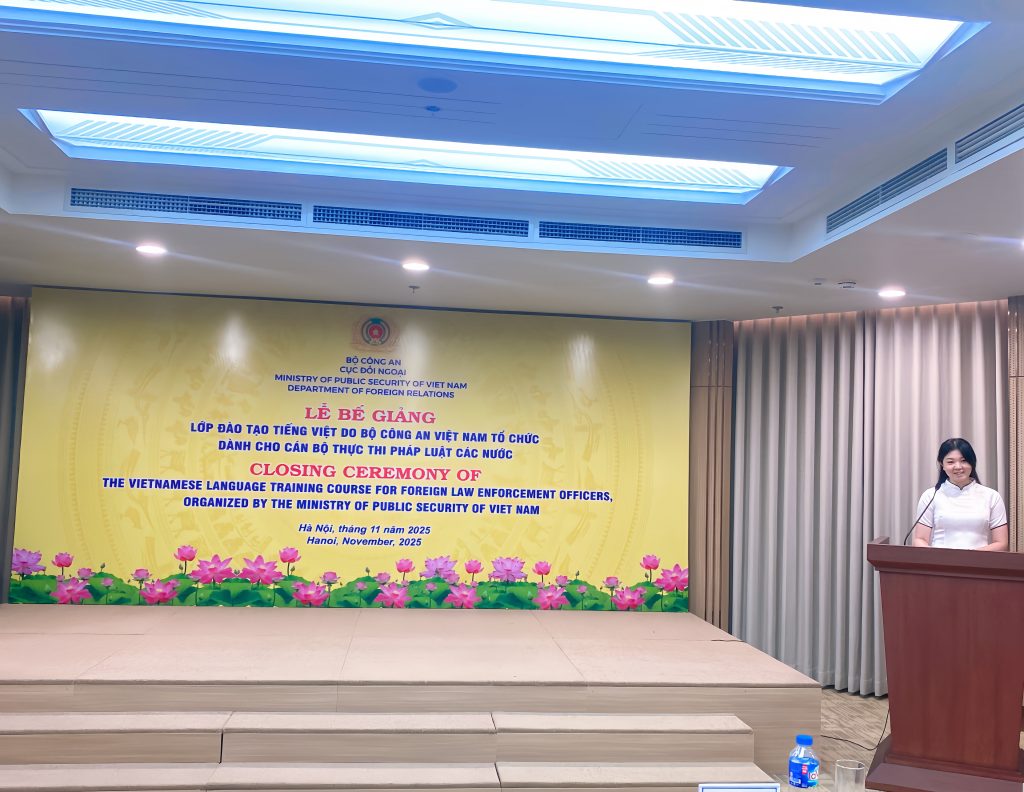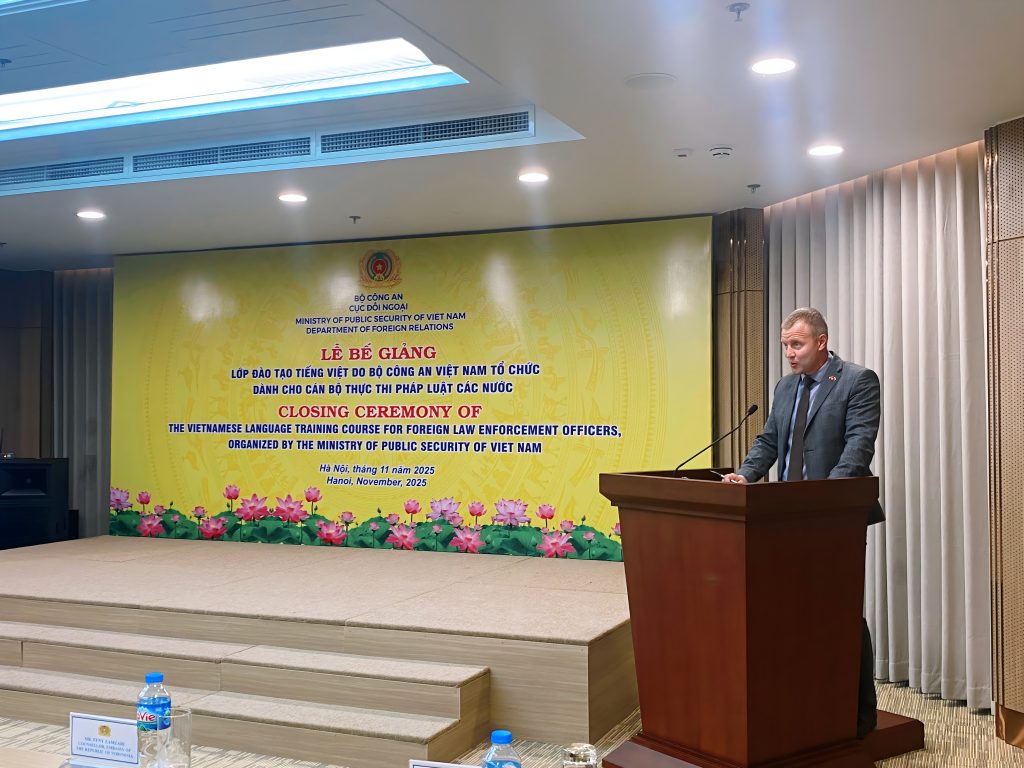 Chiều ngày 27/11/2025, tại trụ sở Bộ Công an, Cục Đối ngoại – Bộ Công an phối hợp với Học viện An ninh nhân dân (ANND) và Trung tâm Giáo dục nghề nghiệp, đào tạo lái xe, ngoại ngữ, tin học thuộc Học viện An ninh nhân dân(GDNN) đã trang trọng tổ chức Lễ bế giảng Lớp đào tạo tiếng Việt Khóa 15 năm 2025 dành cho học viên là các cán bộ thực thi pháp luật đến từ các quốc gia: Trung Quốc, Nga, Lào, Hàn Quốc, Nhật Bản, Indonesia, Philippines, và Angola.