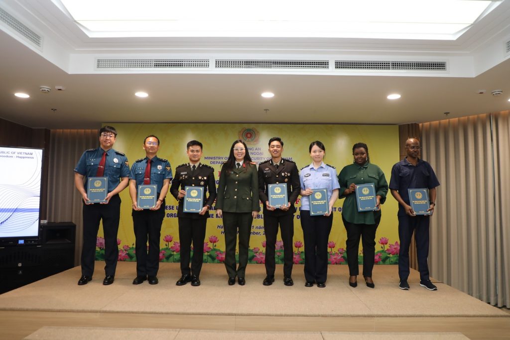 Tại buổi lễ, Ban Tổ chức đã trao chứng nhận hoàn thành khóa học cho các học viên, ghi nhận những nỗ lực và kết quả đạt được. Đại diện học viên đã phát biểu cảm tưởng, bày tỏ tình cảm và lời tri ân sâu sắc tới Bộ Công an Việt Nam, Học viện ANND, các thầy cô giáo và đơn vị tổ chức. Ban Tổ chức cũng trao quà lưu niệm như lời chúc mừng và biểu tượng của tình hữu nghị, hợp tác bền chặt giữa lực lượng Công an Việt Nam và các lực lượng thực thi pháp luật quốc tế.