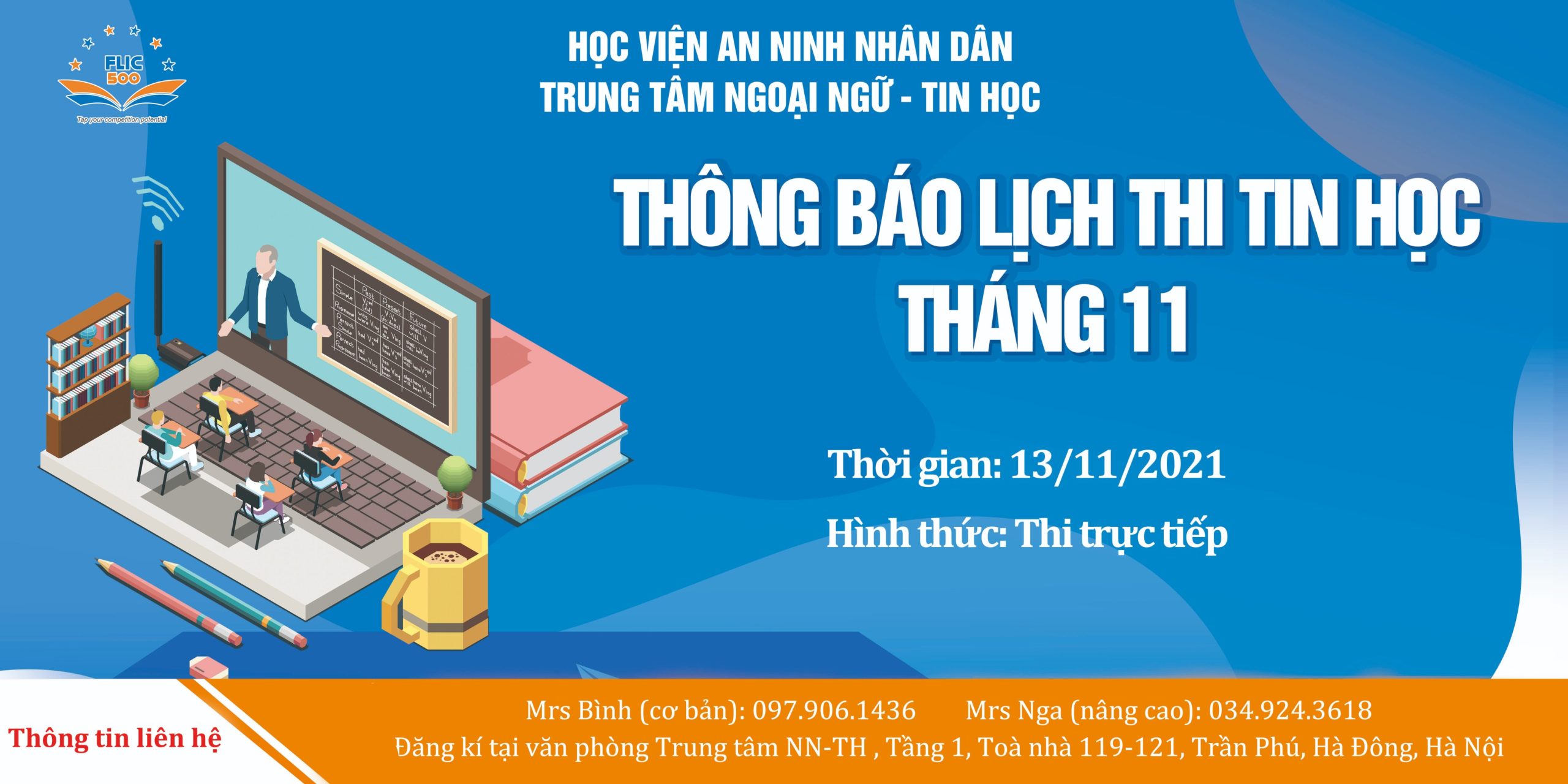 Trung tâm Ngoại ngữ – Tin học Học viện An ninh nhân dân (FLIC500) thông báo lịch bồi dưỡng, thi cấp chứng chỉ tiếng Anh theo khung 6 bậc dùng cho Việt Nam – Kỳ tháng 11, 12/2021 như sau: 1. Kỳ 11/2021: Lịch thi dự kiến: 27/11/2021 Hạn nộp hồ sơ: trước ngày 20/11/2021......