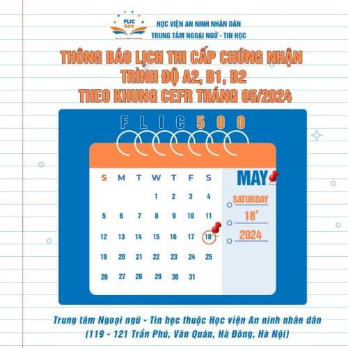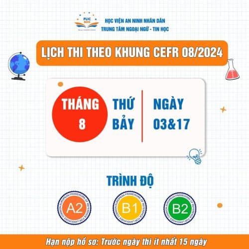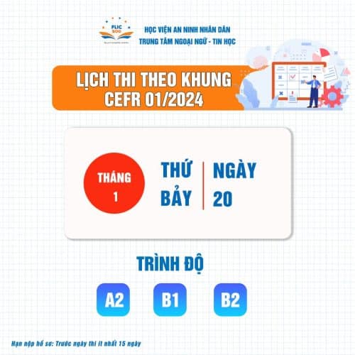 Trung tâm Giáo dục nghề nghiệp, đào tạo lái xe, ngoại ngữ, tin học thuộc Học viện An ninh nhân dân thông báo lịch bồi dưỡng, thi đánh giá năng lực và cấp chứng nhận tiếng Anh trình độ A2, B1, B2 theo Khung tham chiếu chung Châu Âu (CEFR) tháng 10/2024 như sau: 1. Lịch......