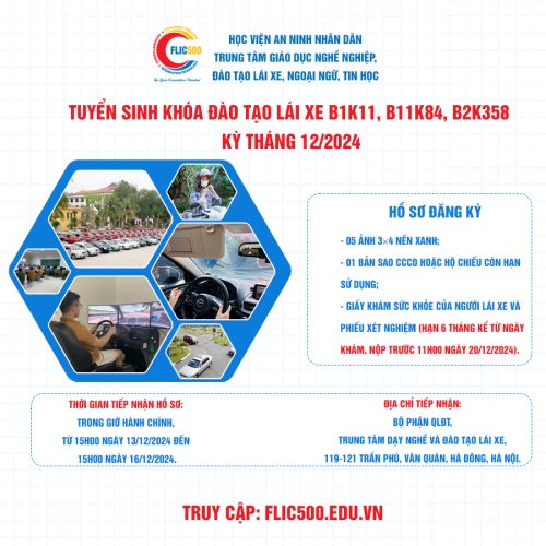 Trung tâm Dạy nghề và Đào tạo lái xe thuộc Học viện An ninh nhân dân thông báo tuyển sinh Khóa Đào tạo lái xe B1K11; B11K84; B2K358 kỳ tháng 12/2024 cụ thể như sau: Thông tin về chương trình đào tạo – Thời gian khai giảng: Dự kiến ngày 23/12/2024; – Chương trình đào......