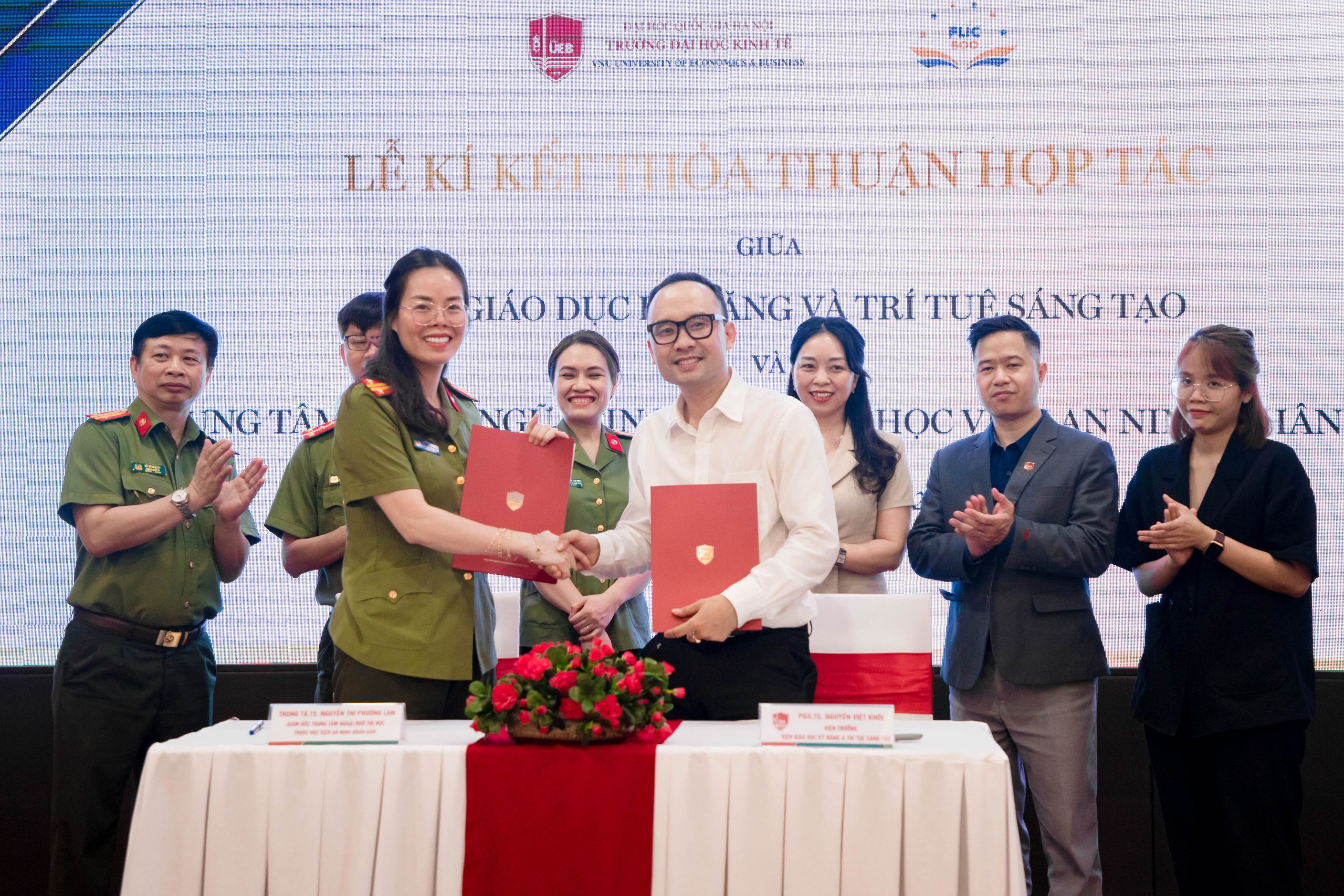 Chiều ngày 11/05/2022 tại Hội trường 801, Nhà E4, 144 Xuân Thủy, Cầu Giấy, Hà Nội đã diễn ra lễ ký kết Biên bản ghi nhớ hợp tác giữa Viện Giáo dục kỹ năng và trí tuệ sáng tạo thuộc trường Đại học Kinh tế, ĐHQGHN và trung tâm Ngoại ngữ – Tin học thuộc Học viện An ninh nhân dân về việc liên kết hỗ trợ tuyển sinh học viên tham gia bồi dưỡng và thi đánh giá năng lực ngoại ngữ.