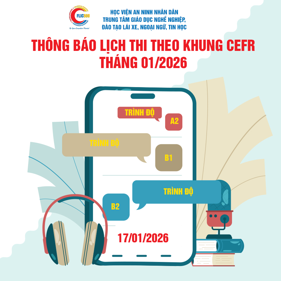 Trung tâm Giáo dục nghề nghiệp, đào tạo lái xe, ngoại ngữ, tin học thuộc Học viện An ninh nhân dân thông báo lịch bồi dưỡng, thi đánh giá năng lực và cấp chứng nhận tiếng Anh trình độ A2, B1, B2 theo Khung tham chiếu chung Châu Âu (CEFR) tháng 01/2026 như sau: