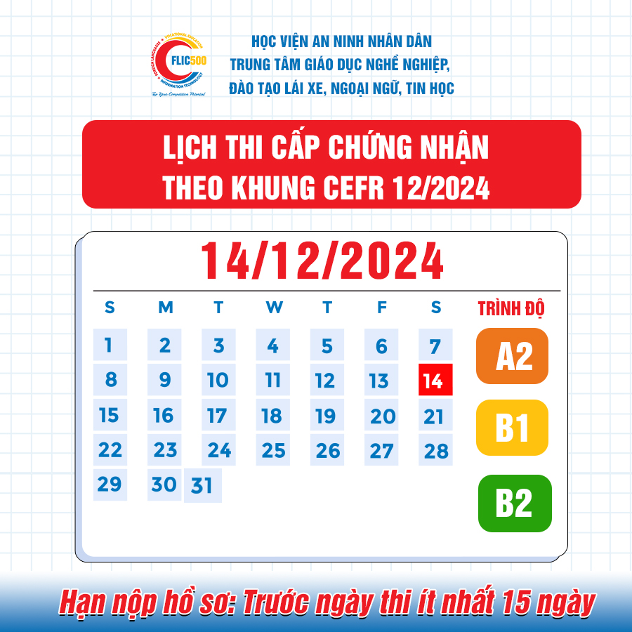 Trung tâm Giáo dục nghề nghiệp, đào tạo lái xe, ngoại ngữ, tin học thuộc Học viện An ninh nhân dân thông báo lịch bồi dưỡng, thi đánh giá năng lực và cấp chứng nhận tiếng Anh trình độ A2, B1, B2 theo Khung tham chiếu chung Châu Âu (CEFR) tháng 12/2024 như sau:
