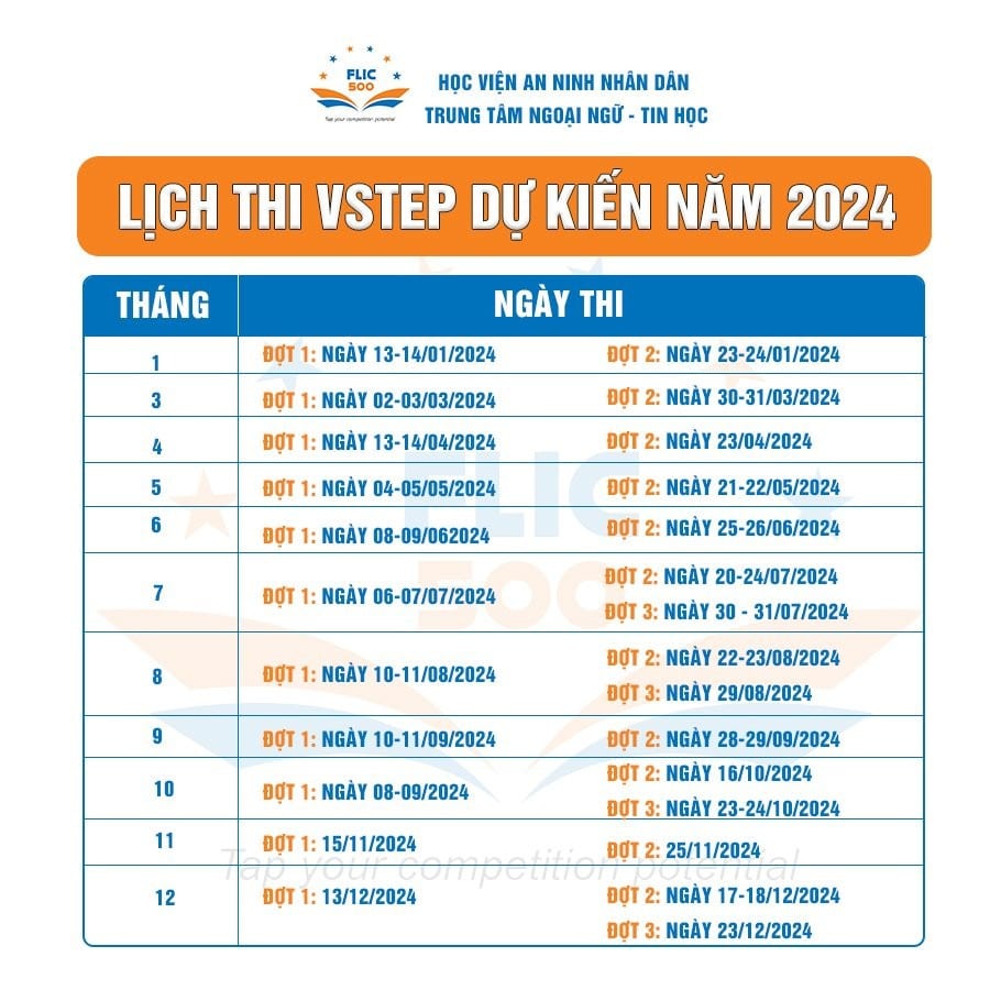 Trung tâm Ngoại ngữ – Tin học thuộc Học viện An ninh nhân dân (FLIC500) thông báo lịch dự kiến các Kỳ thi cấp chứng chỉ tiếng Anh theo Khung năng lực ngoại ngữ 6 bậc dùng cho Việt Nam (VSTEP) năm 2024 cụ thể như sau: