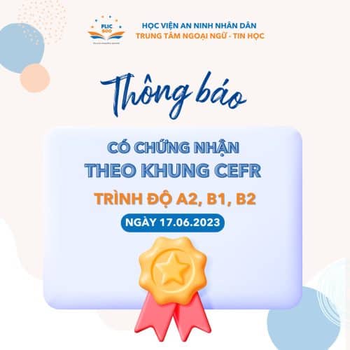 Trung tâm Ngoại ngữ – Tin học thuộc Học viện An ninh nhân dân (FLIC500) thông báo đã có chứng nhận Kỳ thi đánh giá năng lực tiếng Anh theo Khung tham chiếu chung Châu Âu (CEFR) dành cho các thí sinh tham dự kỳ thi ngày 15/07/2023 các trình độ A2, B1, B2. Các thí sinh......