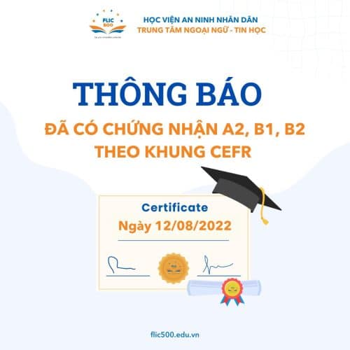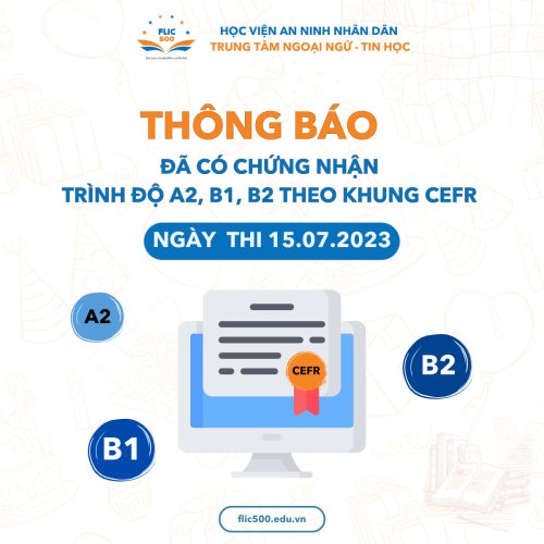 Trung tâm Ngoại ngữ – Tin học thuộc Học viện An ninh nhân dân (FLIC500) thông báo đã có chứng nhận Kỳ thi đánh giá năng lực tiếng Anh theo Khung tham chiếu chung Châu Âu (CEFR) dành cho các thí sinh tham dự kỳ thi ngày 12/08/2023 các trình độ A2, B1, B2. Các thí sinh......