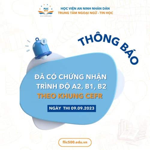 Trung tâm Ngoại ngữ – Tin học thuộc Học viện An ninh nhân dân (FLIC500) thông báo đã có chứng nhận Kỳ thi đánh giá năng lực tiếng Anh theo Khung tham chiếu chung Châu Âu (CEFR) dành cho các thí sinh tham dự kỳ thi ngày 09/09/2023 các trình độ A2, B1, B2. Các thí sinh......