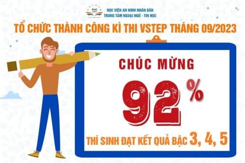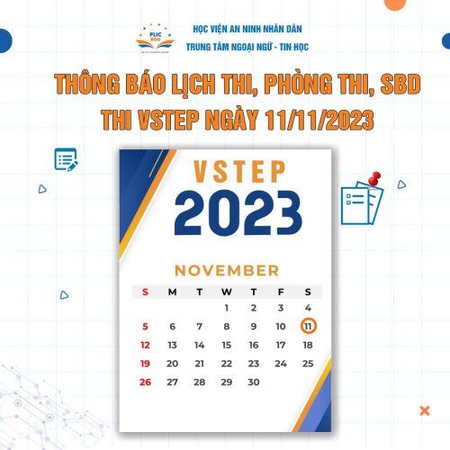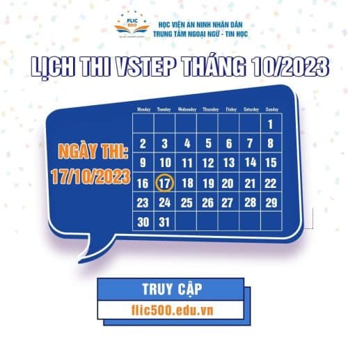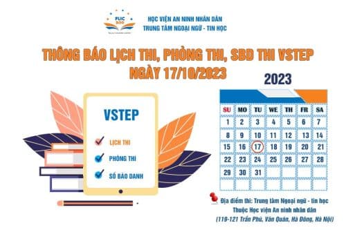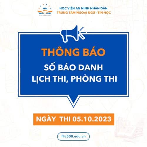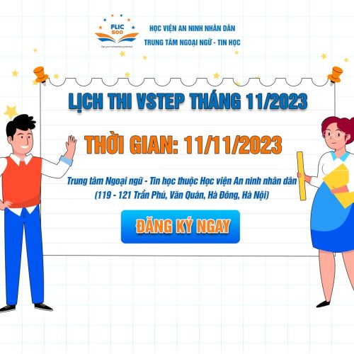 Trung tâm Ngoại ngữ – Tin học Học viện An ninh nhân dân (FLIC500) thông báo lịch thi đánh giá năng lực tiếng Anh Khung năng lực 6 bậc dùng cho Việt Nam (VSTEP) – kỳ tháng 11/2023 như sau: Thí sinh có nguyện vọng dự thi vui lòng đăng ký tại: https://flic500.edu.vn/dang-ky-hoc-thi-tieng-anh-khung-nlnnvn-vstep/ Lịch thi dự kiến: 11/11/2023......