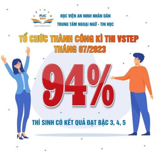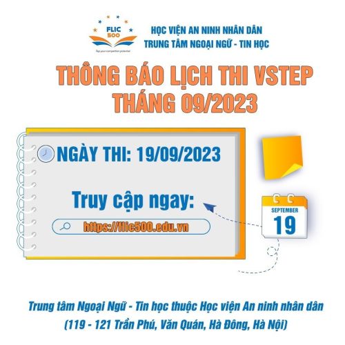 Trung tâm Ngoại ngữ – Tin học Học viện An ninh nhân dân (FLIC500) thông báo lịch thi đánh giá năng lực tiếng Anh Khung năng lực 6 bậc dùng cho Việt Nam (VSTEP) – kỳ tháng 09/2023 như sau: Thí sinh có nguyện vọng dự thi vui lòng đăng ký tại: https://flic500.edu.vn/dang-ky-hoc-thi-tieng-anh-khung-nlnnvn-vstep/ Lịch thi dự kiến: 19/09/2023......