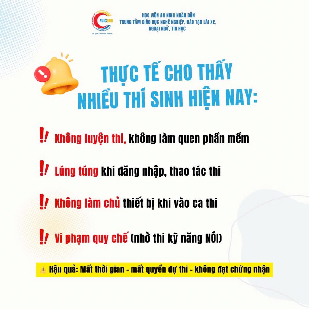 Hiện nay, hiện tượng học viên đăng ký thi chứng nhận A2 CEFR nhưng không có tinh thần thái độ nghiêm túc tham gia luyện thi làm quen với phần mềm thi và định dạng bài thi, dẫn đến kết quả thi không ĐẠT. Quá trình thi không làm chủ thiết bị và KTV của Trung tâm phải hướng dẫn mất thời gian mới vào được phòng thì và phần mềm, cá biệt có thí sinh nhờ thi Kỹ năng NÓI và bị Hội đồng thi đình chỉ thi. Để công tác hỗ trợ thí sinh dự thi đạt kết quả tốt, Giám đốc Trung tâm GDNN đề nghị các thí sinh:
