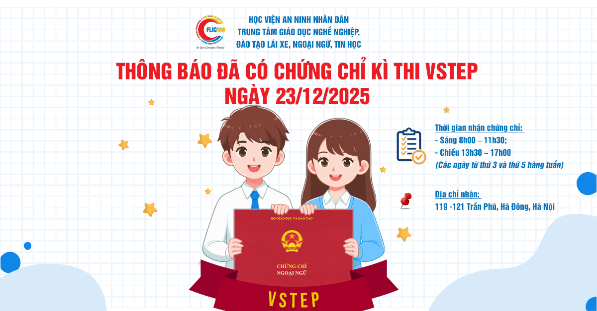 Trung tâm Giáo dục nghề nghiệp, đào tạo lái xe, ngoại ngữ, tin học thuộc Học viện An ninh nhân dân (FLIC500) thông báo đã có chứng chỉ Kỳ thi đánh giá năng lực tiếng Anh theo khung năng lực 6 bậc dùng cho Việt Nam dành cho các thí sinh tham dự kỳ thi ngày 23/12/2025