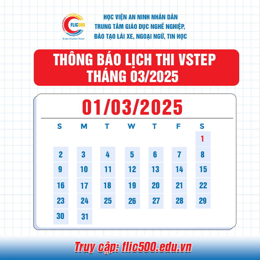 Trung tâm Giáo dục nghề nghiệp, đào tạo lái xe, ngoại ngữ, tin học thuộc Học viện An ninh nhân dân thông báo lịch thi đánh giá năng lực tiếng Anh Khung năng lực 6 bậc dùng cho Việt Nam (VSTEP) – kỳ tháng 03/2025 như sau: