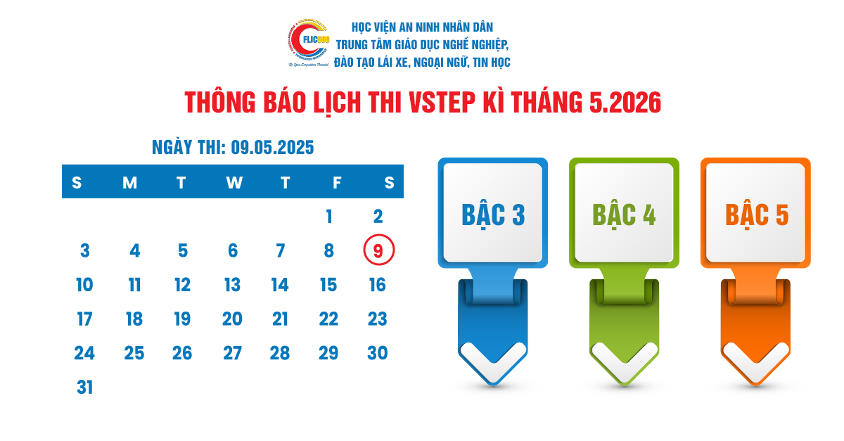 Trung tâm Giáo dục nghề nghiệp, đào tạo lái xe, ngoại ngữ, tin học thuộc Học viện An ninh nhân dân thông báo lịch thi đánh giá năng lực tiếng Anh Khung năng lực 6 bậc dùng cho Việt Nam (VSTEP) – kỳ tháng 05.2026 như sau: