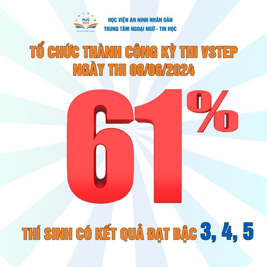 FLIC500 trân trọng cảm ơn các thí sinh đã phối hợp cùng Trung tâm thực hiện tốt các yêu cầu của Hội đồng thi. Cùng với đó, FLIC500 cũng vui mừng thông báo tỷ lệ kết quả đạt là 61% thí sinh đạt bậc 3, bậc 4, bậc 5.