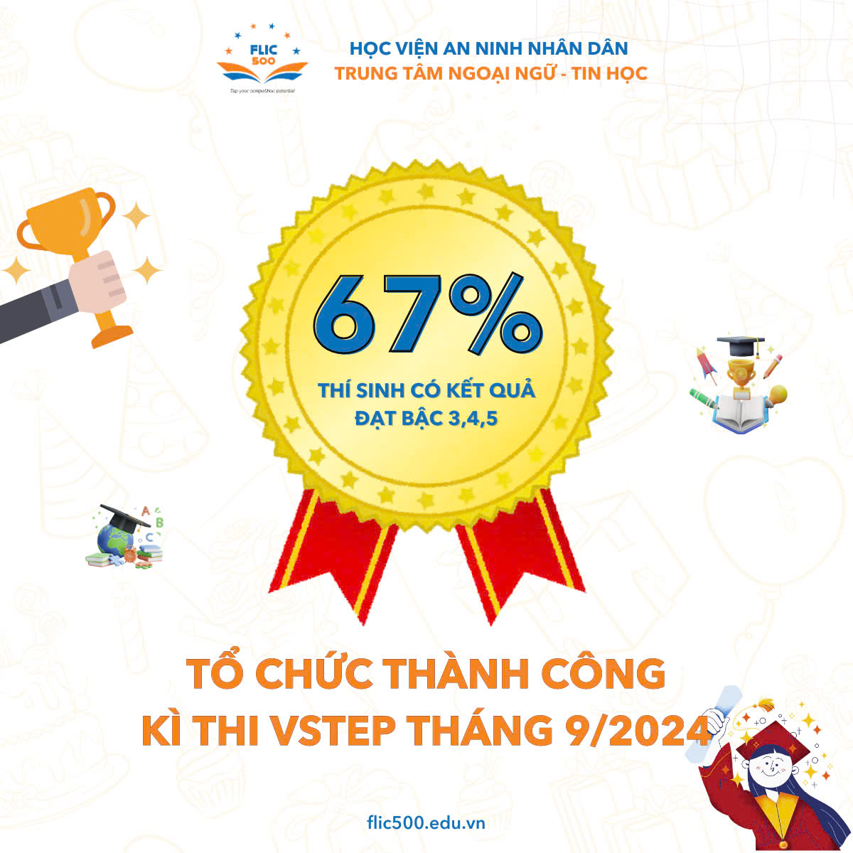 FLIC500 trân trọng cảm ơn các thí sinh đã phối hợp cùng Trung tâm thực hiện tốt các yêu cầu của Hội đồng thi. Cùng với đó, FLIC500 cũng vui mừng thông báo tỷ lệ kết quả đạt là 67% thí sinh đạt bậc 3, bậc 4, bậc 5.